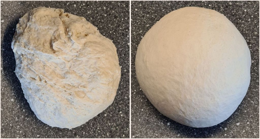 Meanwhile, divide your dough into two equal portions with a bench knife, loosely form them into balls. Dust your work area with a bit of semonlina flour to keep the dough from sticking or work directly on a piece of parchment. Make two flat breads by carefully pushing and pulling the dough, always working from the middle towards the edges.