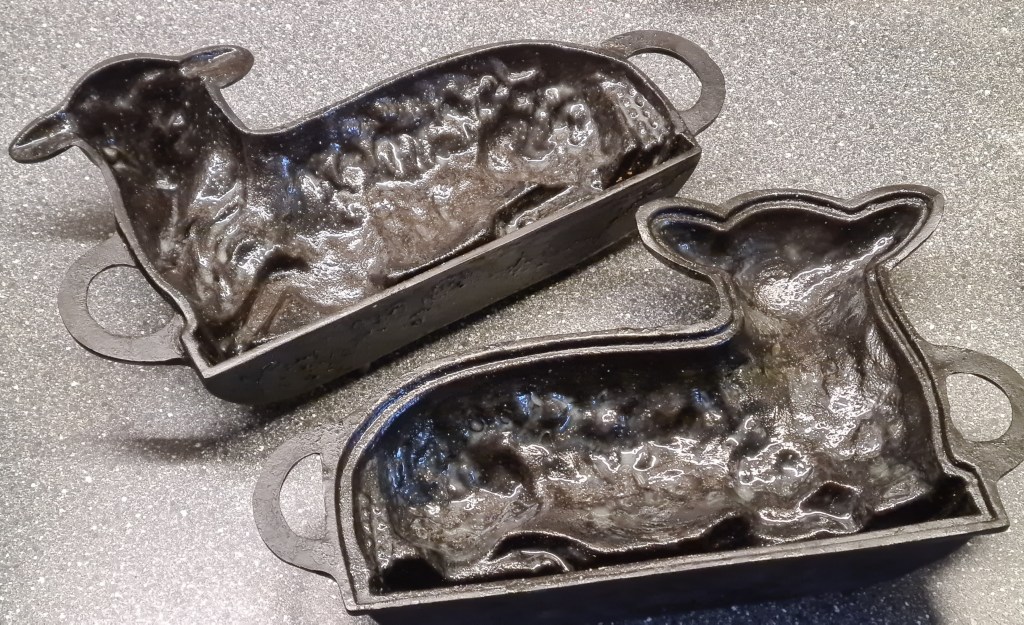 I managed to dig my great grandma’s cast iron lamb mold out of the basement a few years ago. It was in questionable shape and a bit rusty, like most of my cast iron when I acquire it, but I had it quickly back to its deep, dark glow.