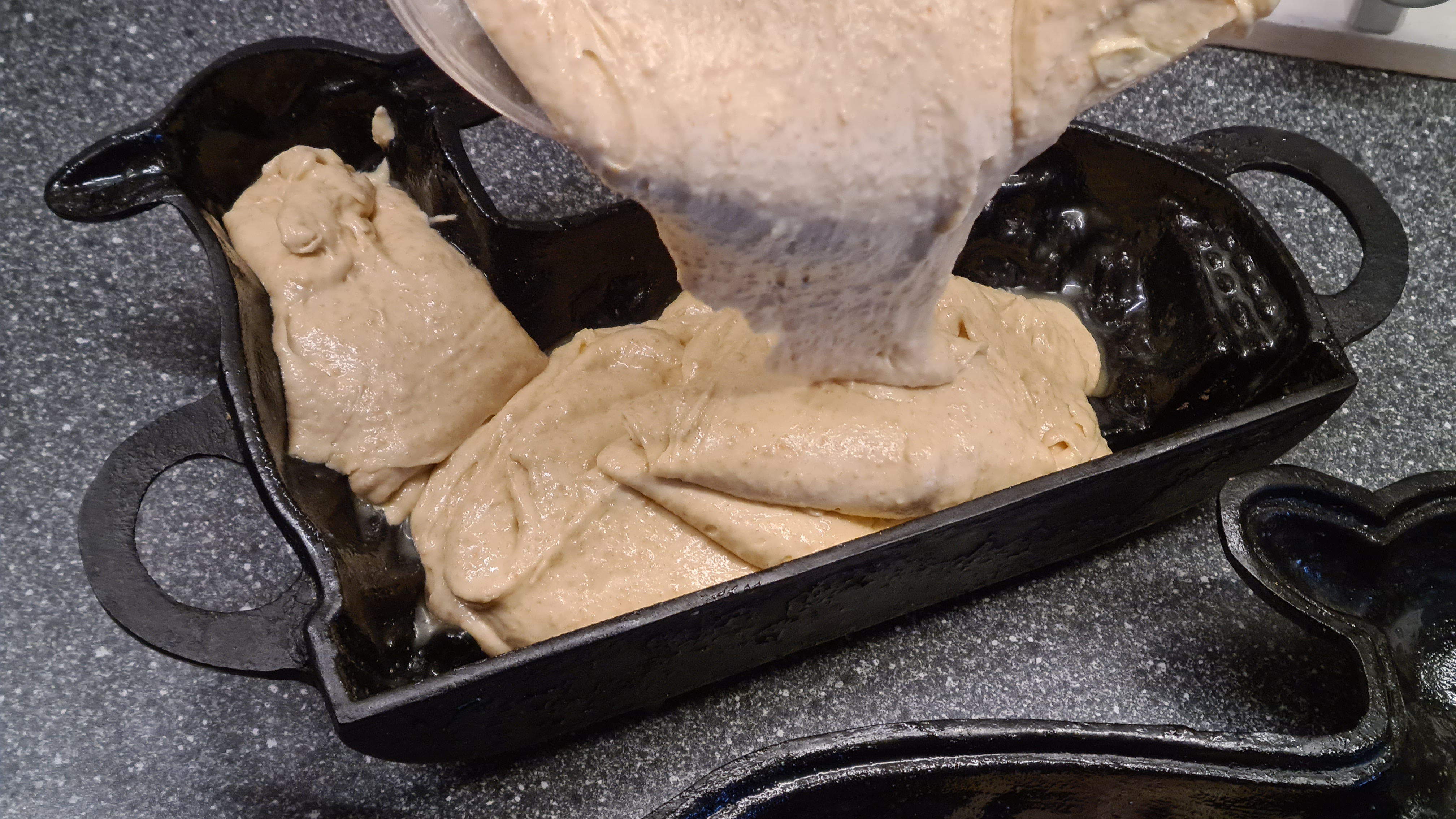 Make sure your cake mold is clean(ish), then grease it properly. I use my homemade pan grease for my cast iron, it releases all the baked goodies like a charm. Give the pan time to soak up a bit of the grease while you make the batter and you’ll see if you need to add a bit more in certain spots.