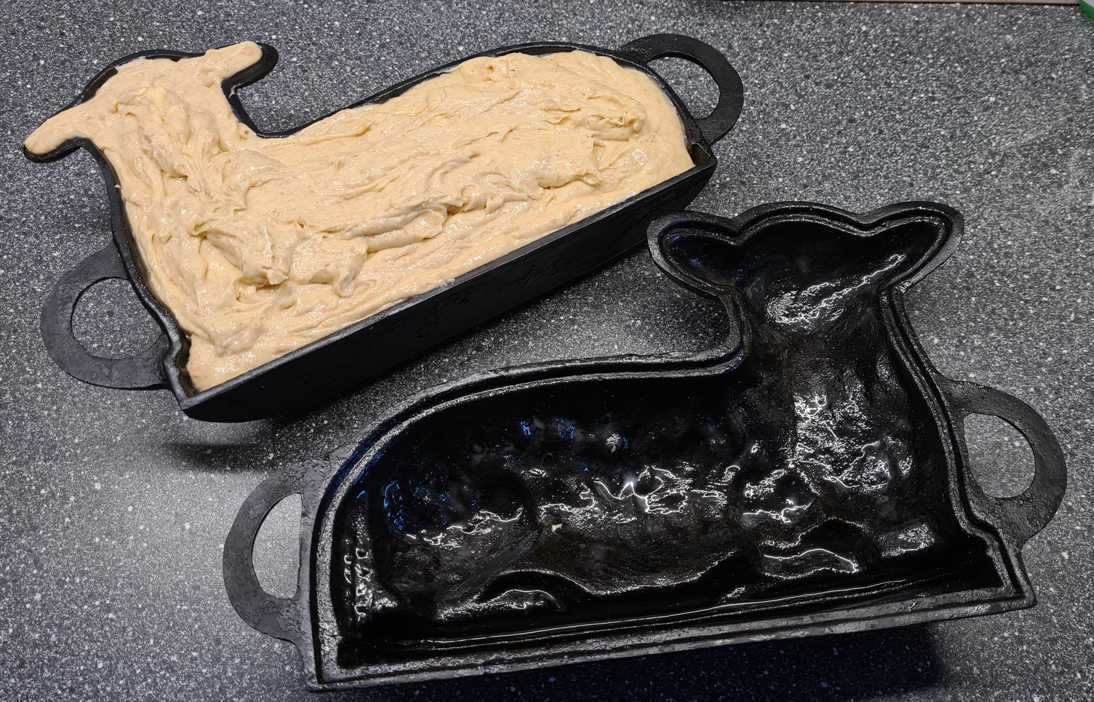 The secret to a good looking lamb cake is picking a recipe that’s rich in eggs and butter. You don’t want anything low fat (at least not in the cast iron), or things will get really sticky really fast. And there’s nothing worse than a celebration with a lamb cake that’s missing half its face because it’s stuck in the pan. I have my great grandma’s recipe, but kept messing with it over the years. Now, the lamb cake is always a different one. This one is half whole einkorn.