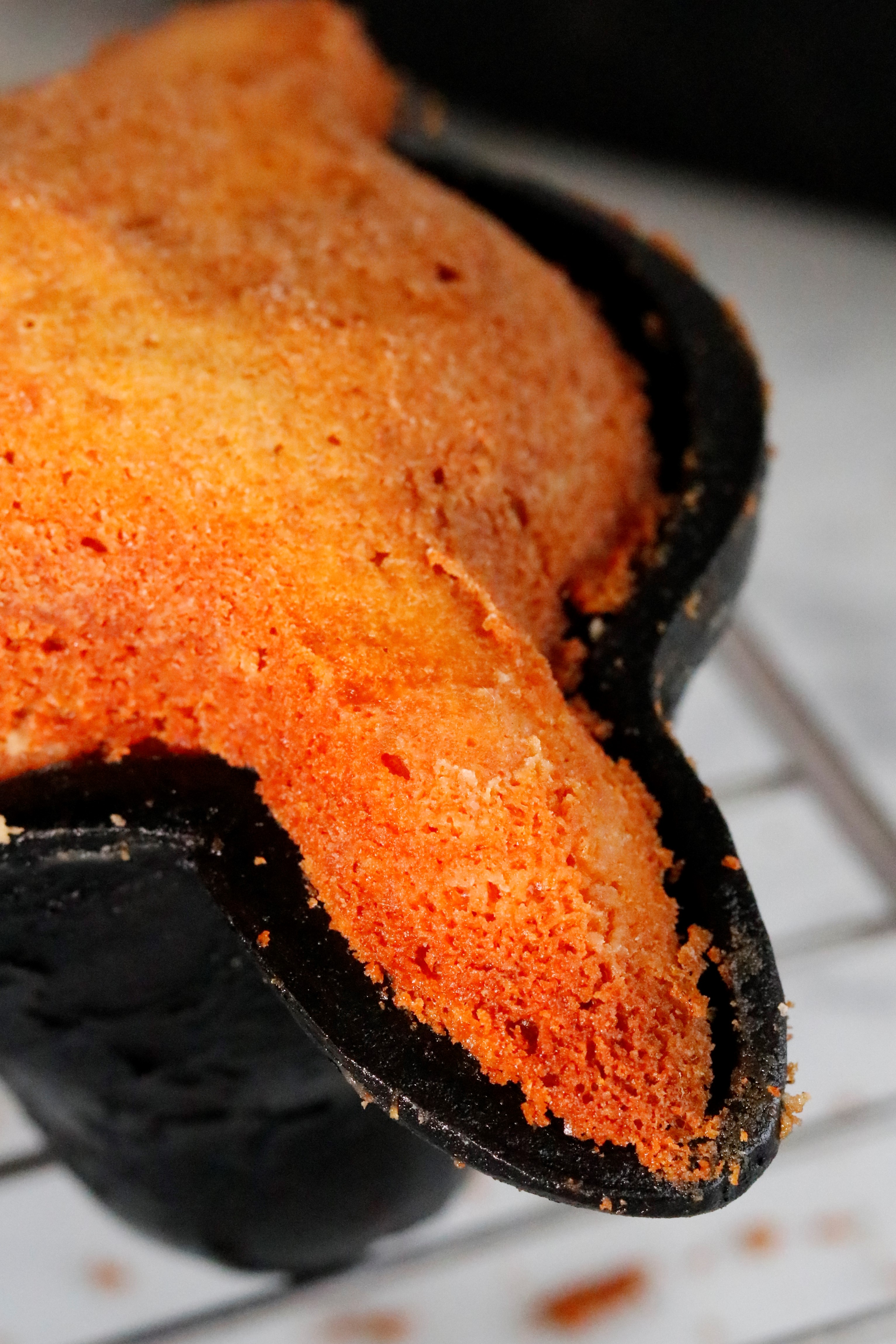 After those 45 minutes, take the mold out of the oven and place it on a wire rack. Ignore it for the next half hour, until it’s just warm to the touch and you can handle it without gloves. That way the cake can settle, IF there’s anything stuck, it can steam itself loose, and the cake will be sturdier and easier to handle.