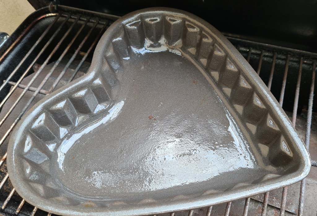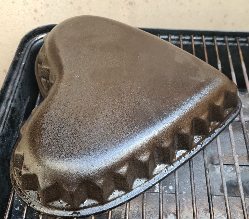 I dried and pre-heated the pan on the grill, then brushed it with coconut oil on both sides, let the excess drip back into the oil jar, and baked it upside down for 30 minutes. The photo is right after making a mess with the first layer of oil.