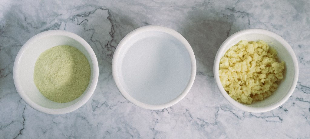 I didn’t feel like cooking potatoes just for the burger buns, it was a spur of the moment thing after all. So I replicated the potato with potato flakes (like instant mash potatoes). 50g potato flakes mixed with 150g water give you exactly what you need.