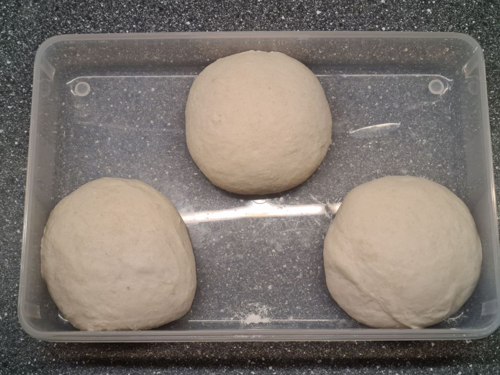 Divide the dough into 3 portions and shape those into balls. Oil them slightly, place them in an oiled container where they have room to spread out, and cover them.