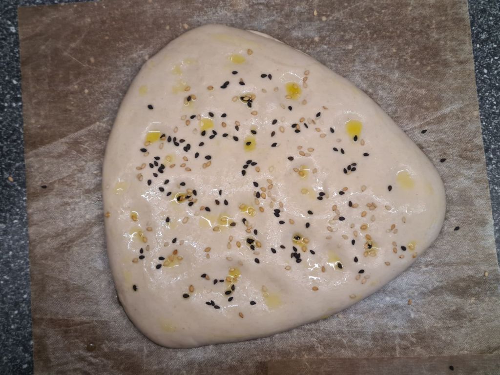 Place the breads carefully on individual sheets of parchment, drizzle with a little bit of olive oil, oil your hands and spread the dough out further by giving it dimples with your fingers. It’s a bit like making focaccia, just not as soft.
