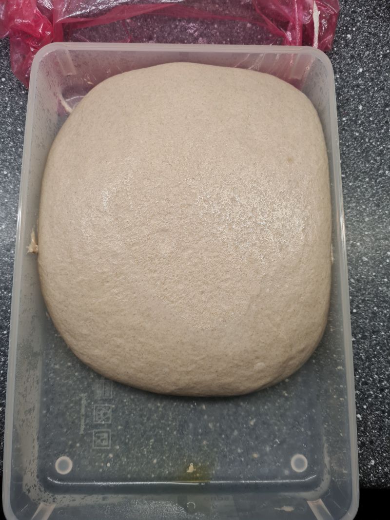 Form a ball, place it in a slightly oiled container, cover it up again and place it in the fridge overnight where it can rise to double its size. Doughs reside on the top shelf in my fridge, where it’s about 8°C.