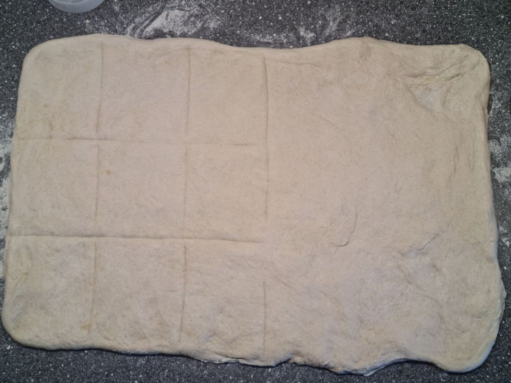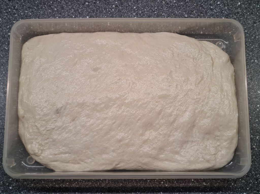 I like to use rectangular freezer boxes for the bulk rise. We need a rectangle later, preferably without using a rolling pin, so it makes the next step easier.