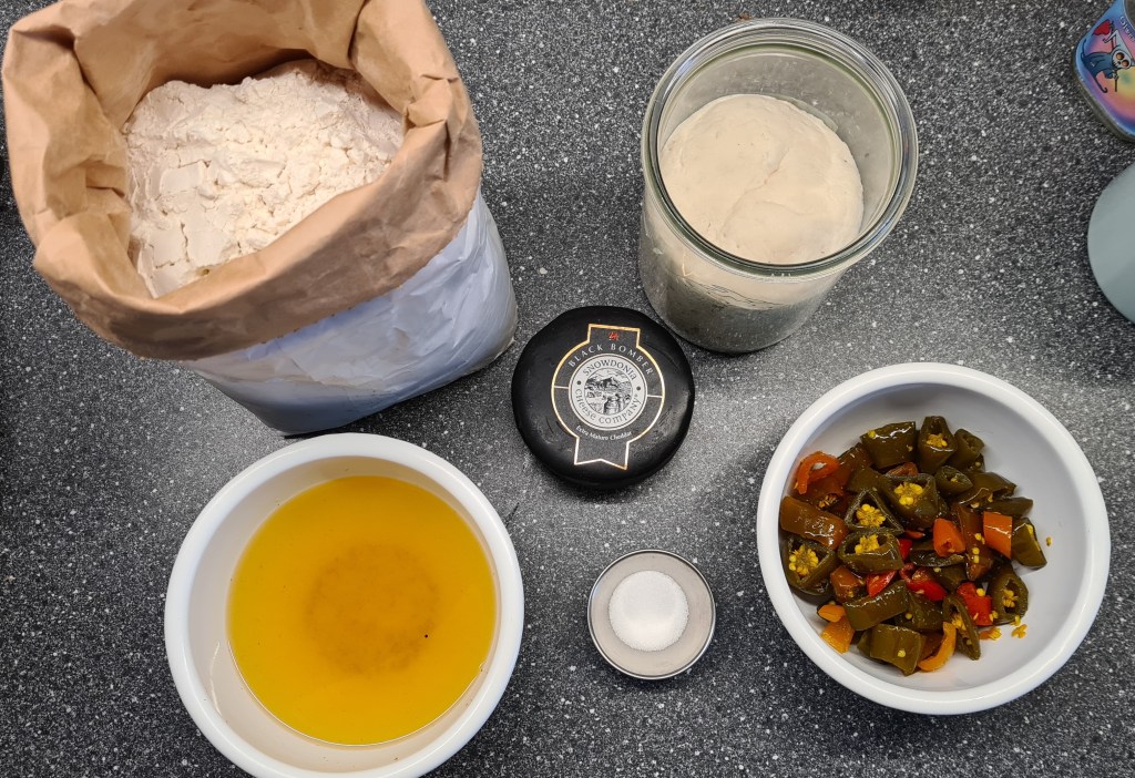 Meanwhile, roughly chop the jalapenos and cube the cheddar. Don’t make the cheese pieces too small if you want them visible in the finished bread.