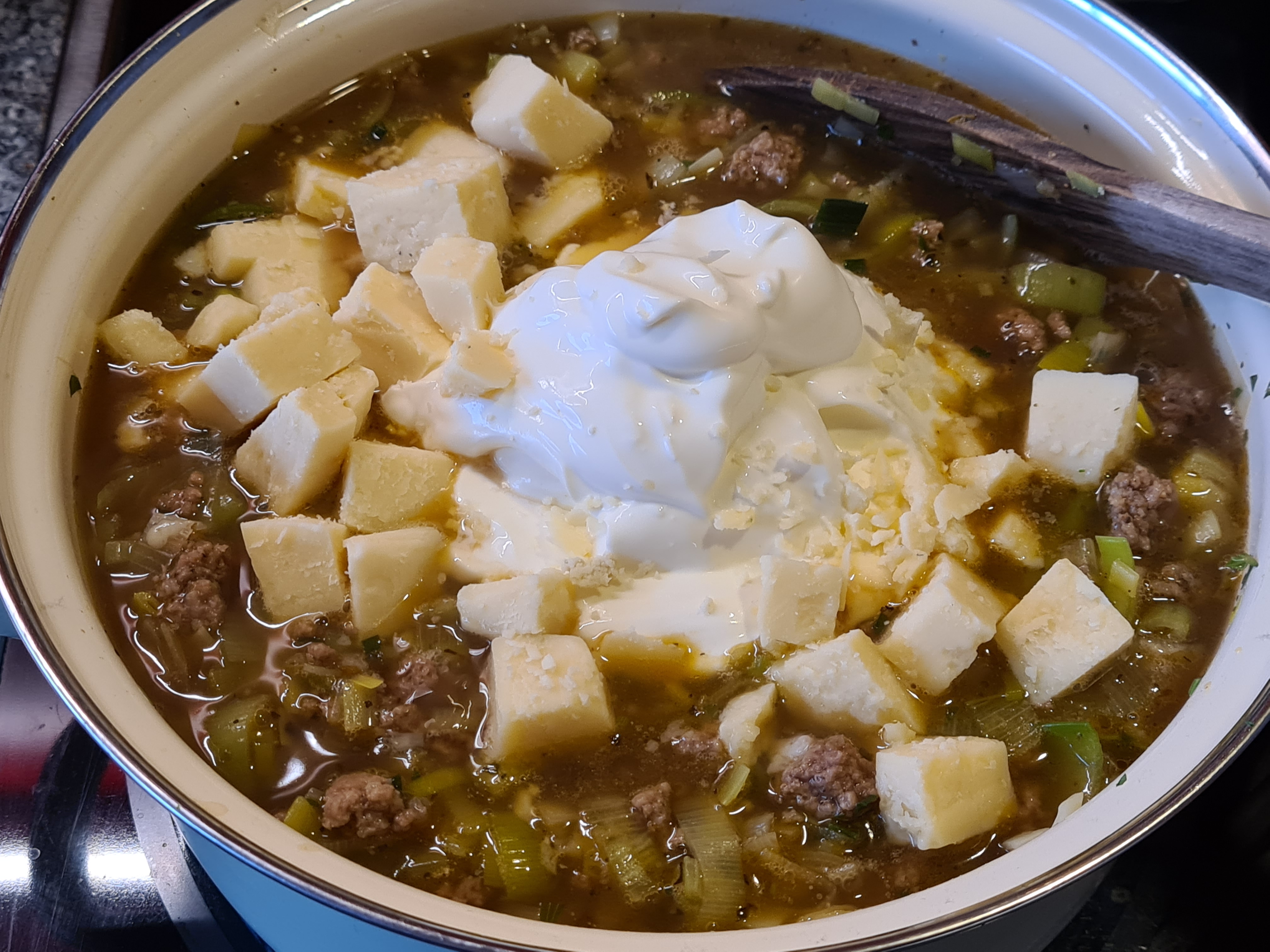 Close the lid, bring the soup to a gentle boil and let it simmer for about 10 minutes. Then add the crème fraîche and the cheese and let it slowly melt into the soup. Keep stirring!