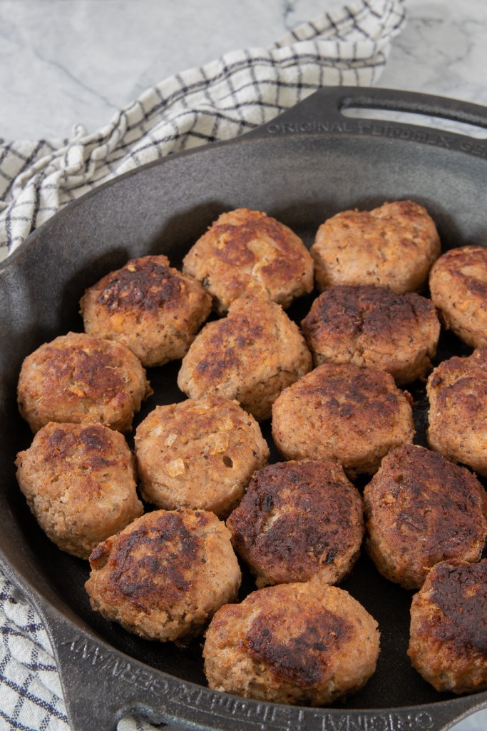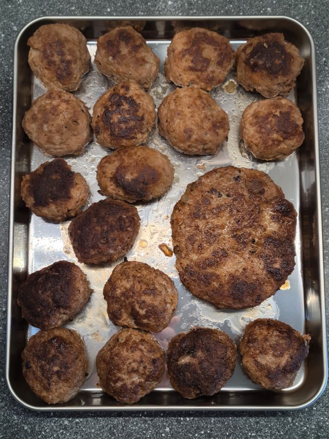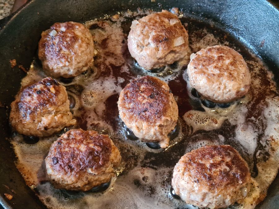 Fry the meatballs (I use clarified butter) until they’re well browned and cooked through.
