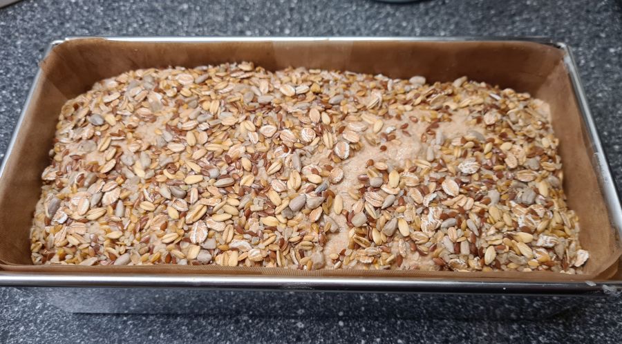 With wet hands, press the dough flat, so it’s even in the pan. You can add some seeds if you want, or leave it plain. I used a mix of sesame, linseed, sunflower and some flaked grains. Press your topping to the dough.