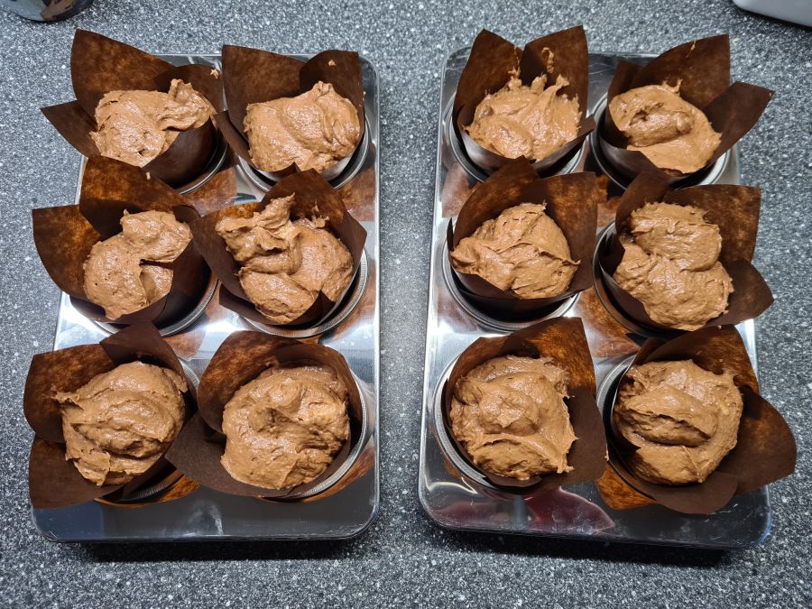 Melt the chocolate (and cocoa butter) in the hot espresso. Mix everything together and scoop the batter into muffin papercups. I used the extra high tulip ones and got exactly 12. If you use the flatter, regular ones you’ll get 20-24.