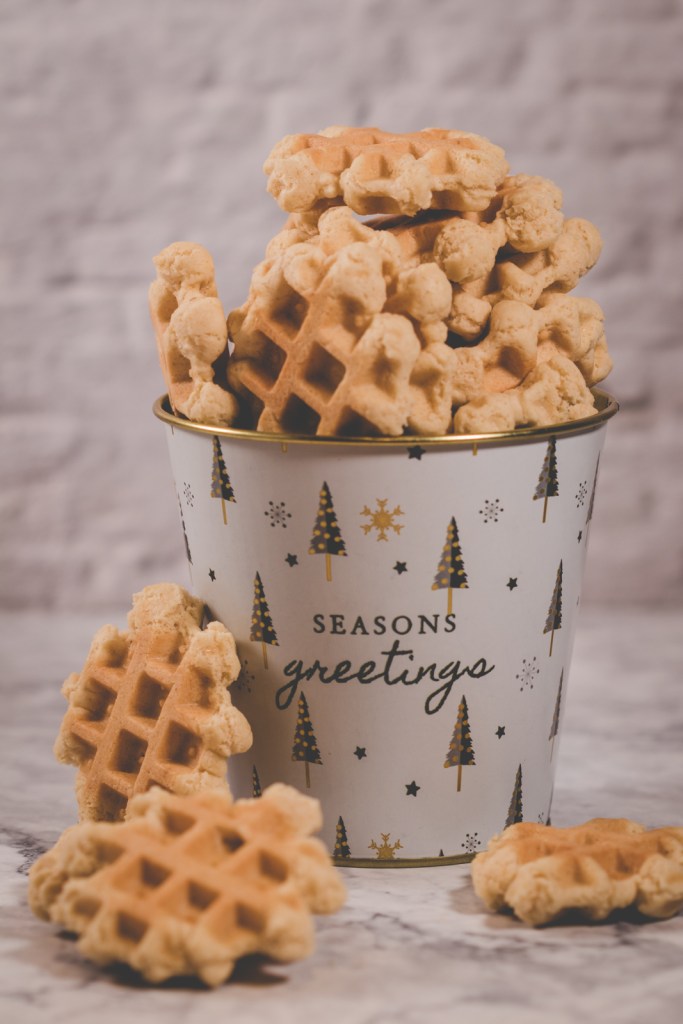 This is a recipe I love to make with the kindergarten kids at work. I don’t need a full kitchen, just an outlet and a waffle iron (or two) and the kids are kept busy rolling ball after ball. Baking them all takes a bit of time, but I don’t mind sacrificing a whole morning to waffle cookies. We always make a huge batch, so every kid can fill the iron twice, and the bigger ones can remove them with a wooden fork.