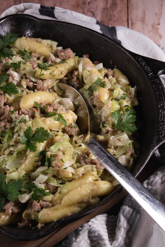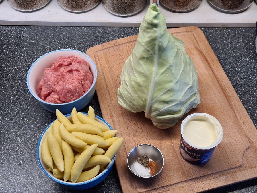 This is a tytpical german one pan dish, made of finger sized potato dumplings, spicy ground pork and pointed cabbage. You need very little ingredients, very little time, and get a hearty and filling meal out of it.