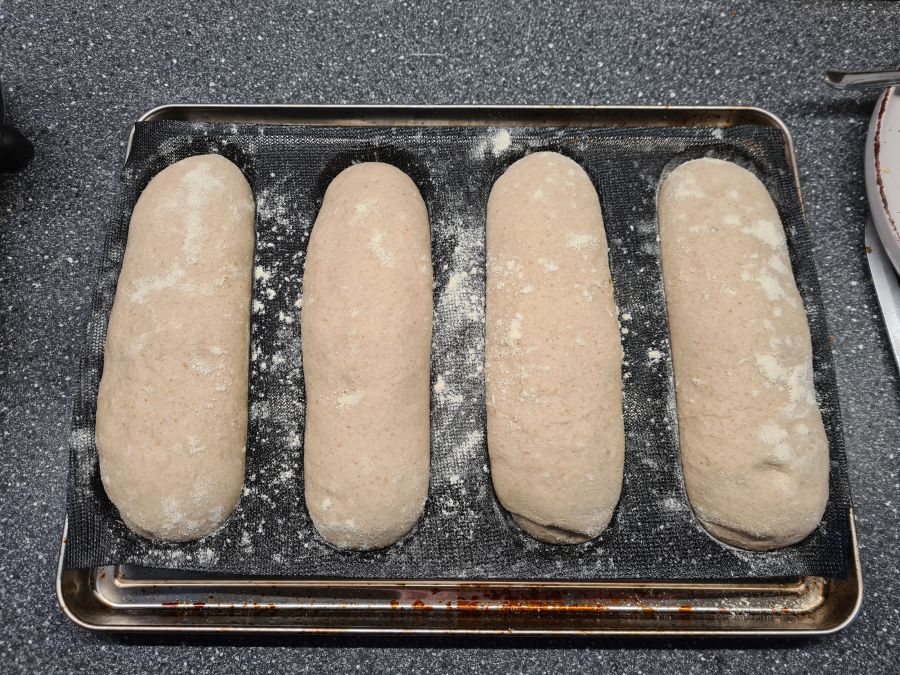 I have my hoagies in the silicone mesh mold to keep them from baking together. If you have a bit more room in the oven than I do, feel free to bake freeform and seperate them a bit further.