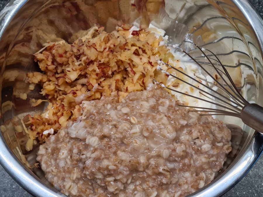 Meanwhile, drop the yogurt in a bowl and roughly grate the apples on top. Add the porridge when it’s done and mix everything. That’s it. Base done.
