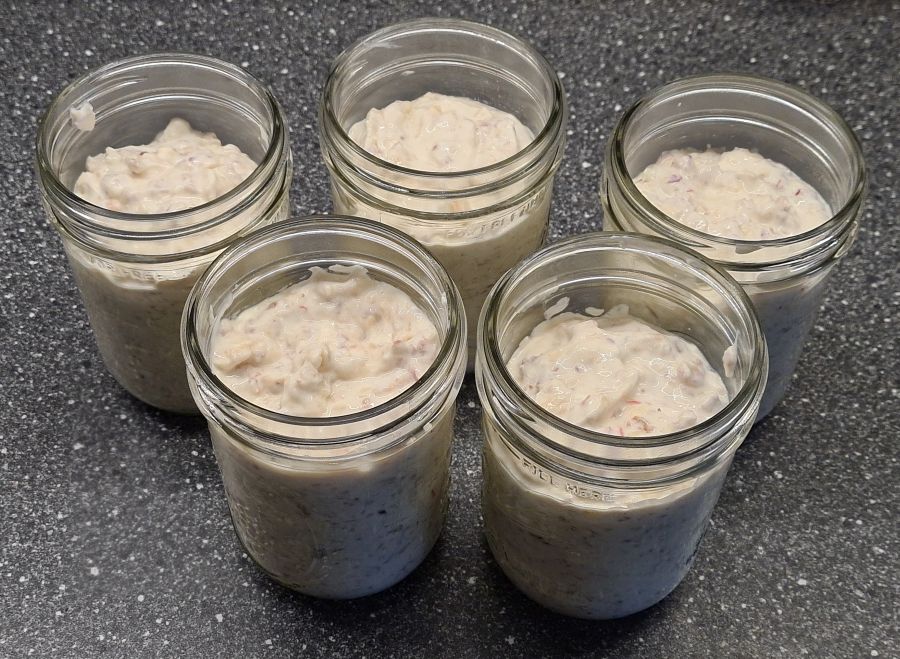 Now all you have to do is divide the porridge base into equal portions and stash those in the fridge for breakfast or whenever you want some. I had one for lunch today, and it’s soup saturday as I’m writing this.