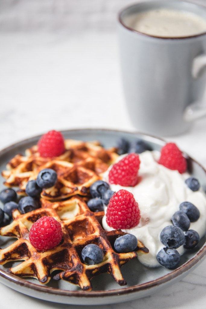 Serve the waffles with the yogurt cream and fresh berries. Enjoy!