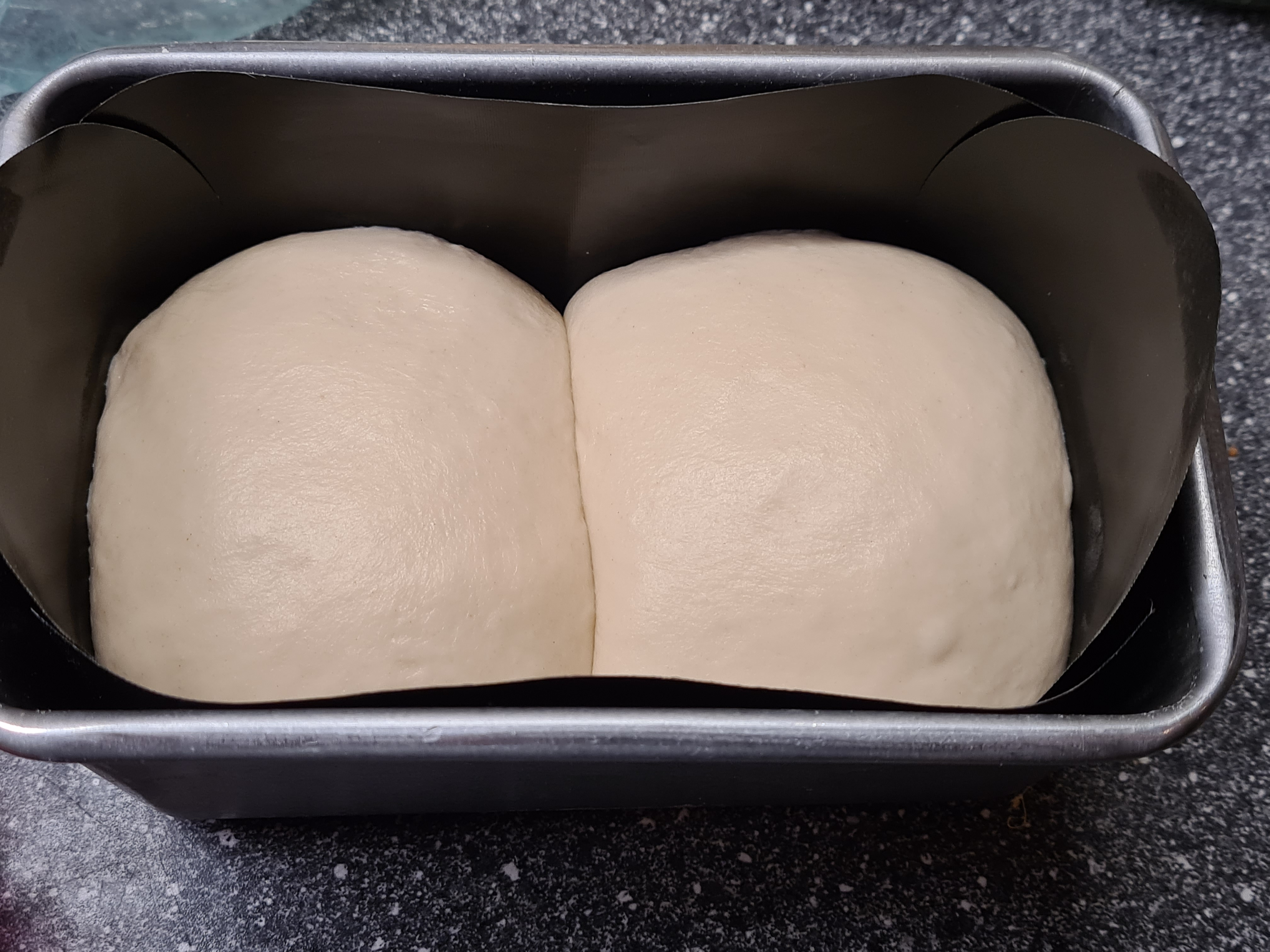 Give the dough about 20 minutes of rest, it makes shaping easier. Divide the dough into two equal portions, then shape them each into a ball. Place the balls in a prepared loaf pan and let the bread rise until it’s doubled in size.
