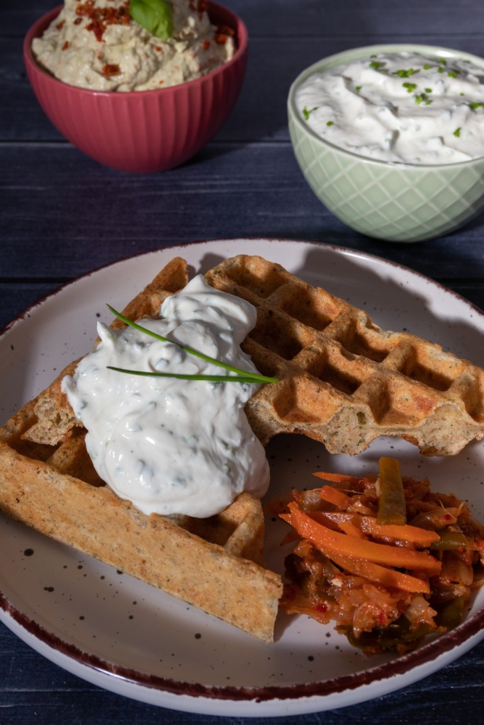 I hope you give these savory waffles a try. Topped with Ulli’s not so secret dip and a bit of kimchi on the side they’re absolutely delicious!