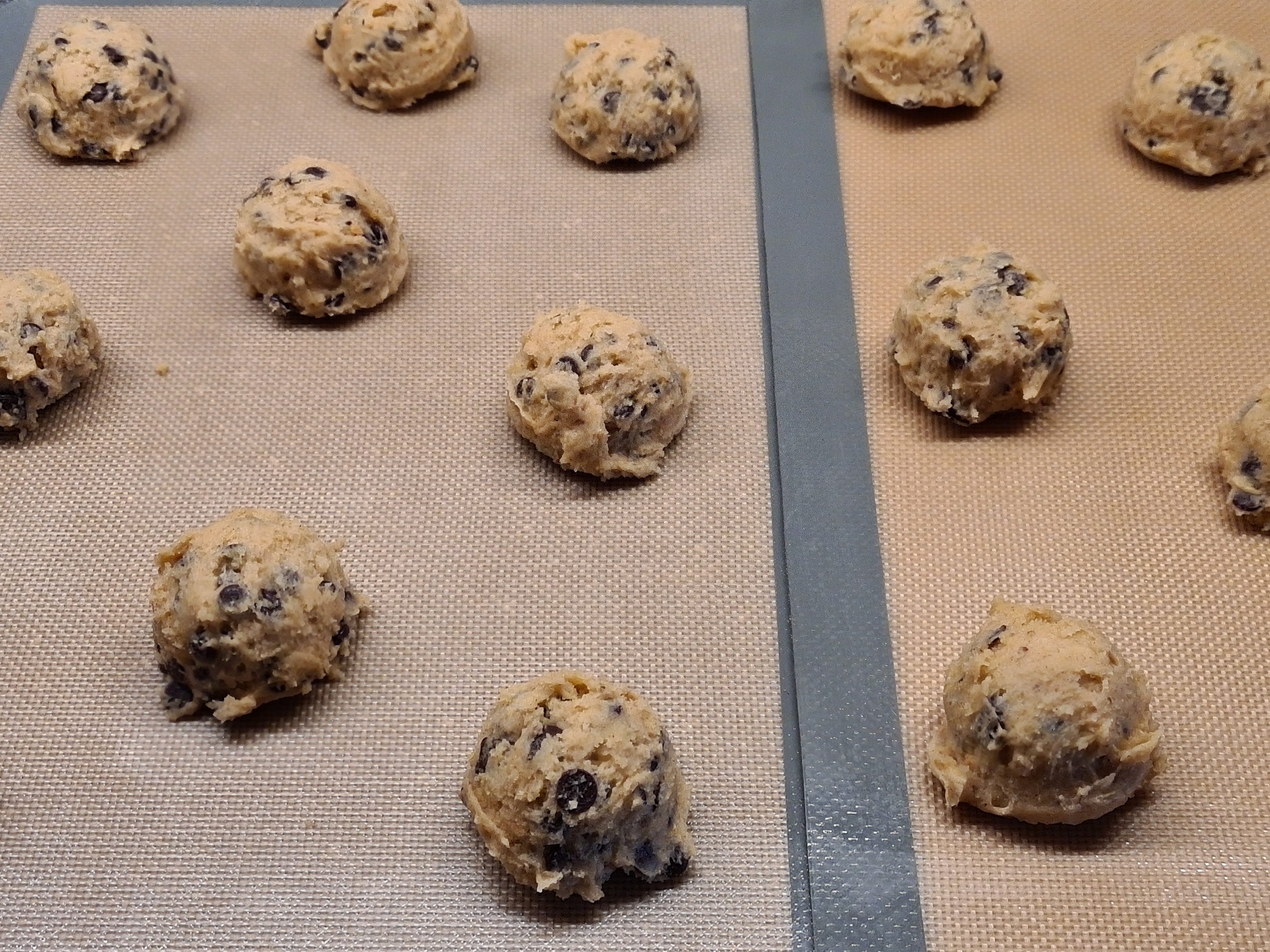 Place the balls about 5cm / 2 inches apart on a parchment or silicone lined cookie sheet and bake in a pre-heated oven at 170°C / 340F for about 12-15 minutes if you want chewy cookies, for about 15-18 minutes if you prefer them crunchy.