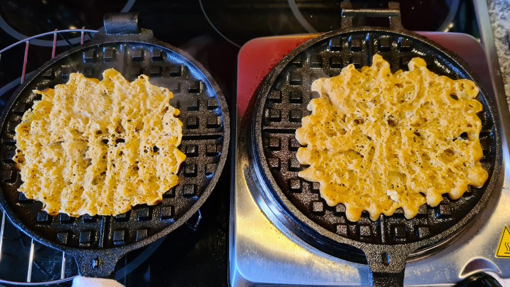 The smaller ones, like my goro and krumkake irons, as well as the Rome one, get used on a gas burner outside or on a hotplate inside and need to be flipped during the baking process. I let the batter set for few seconds after filling the iron, then flip it and bake the waffle on the other side for a bit, then flip back.