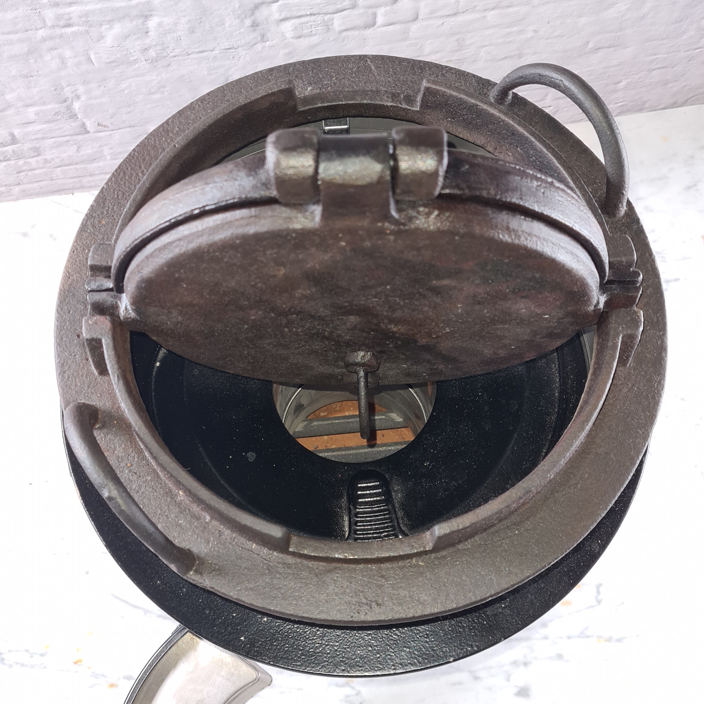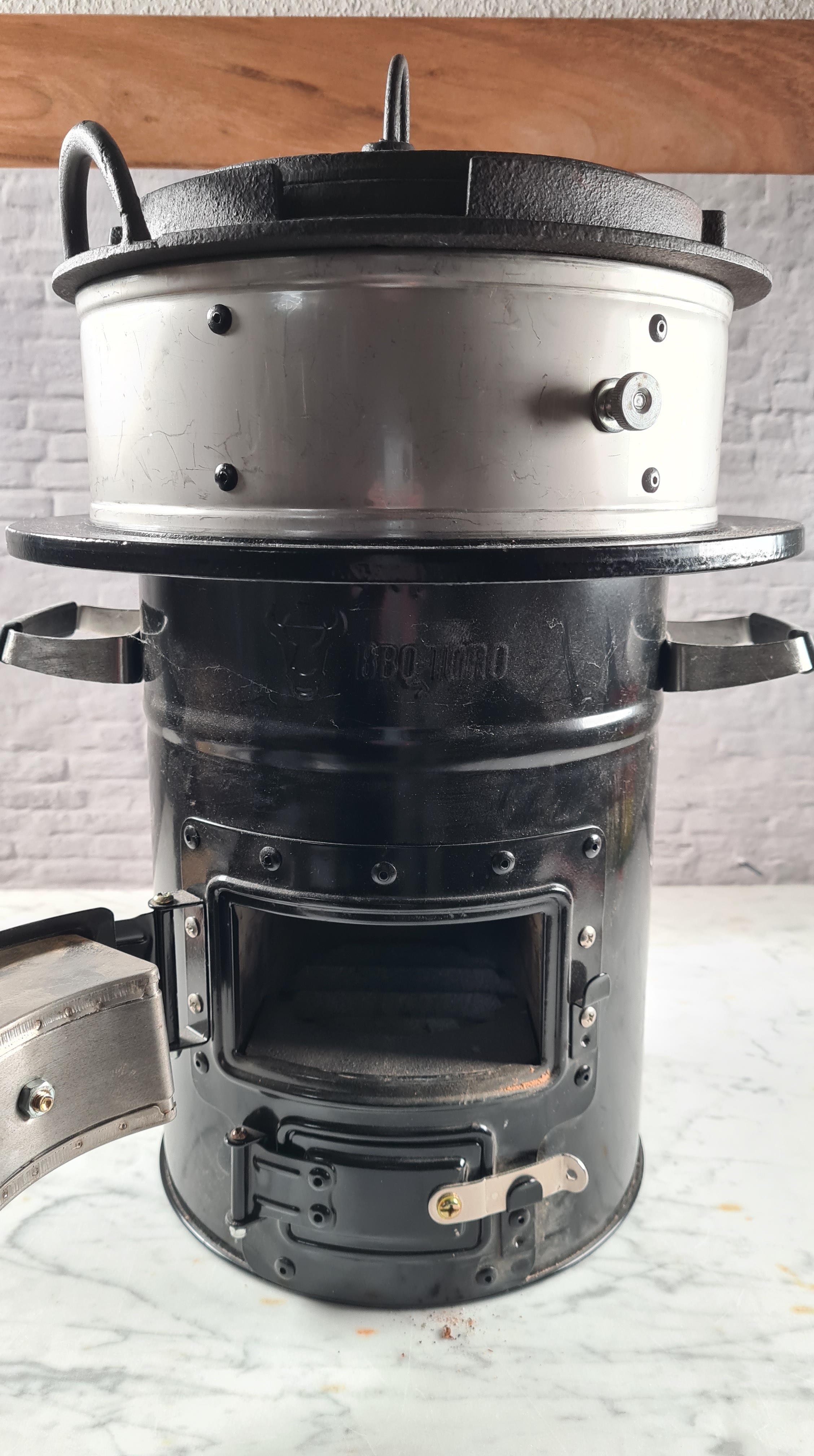 It was sold as a power-ring from the rocket stove’s manufacturer. The idea is that a pan or dutch oven rest snugly on the ring and so sit on a bigger heat source than just the small opening. It supposedly saves 25% on burning material. I never checked that, but it increases the bottom heat area and lifts the iron up 8cm, which makes it perfect. Those 25€ were money well spent.