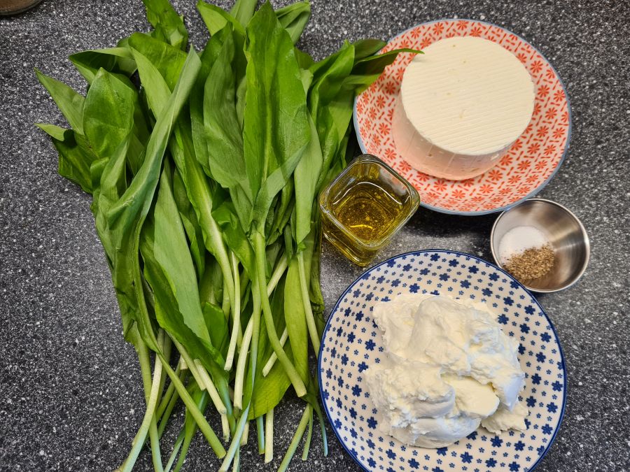 Wash and roughly chop the wild garlic. Crumble or cut up the cheese. Fill all the ingredients except the spices into a blender or a high container to use a stick blender.