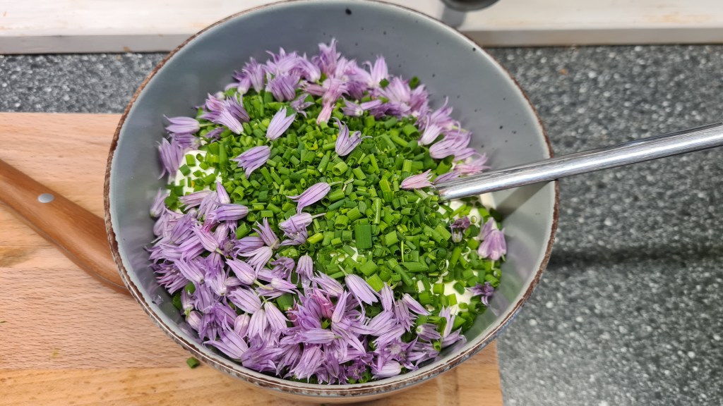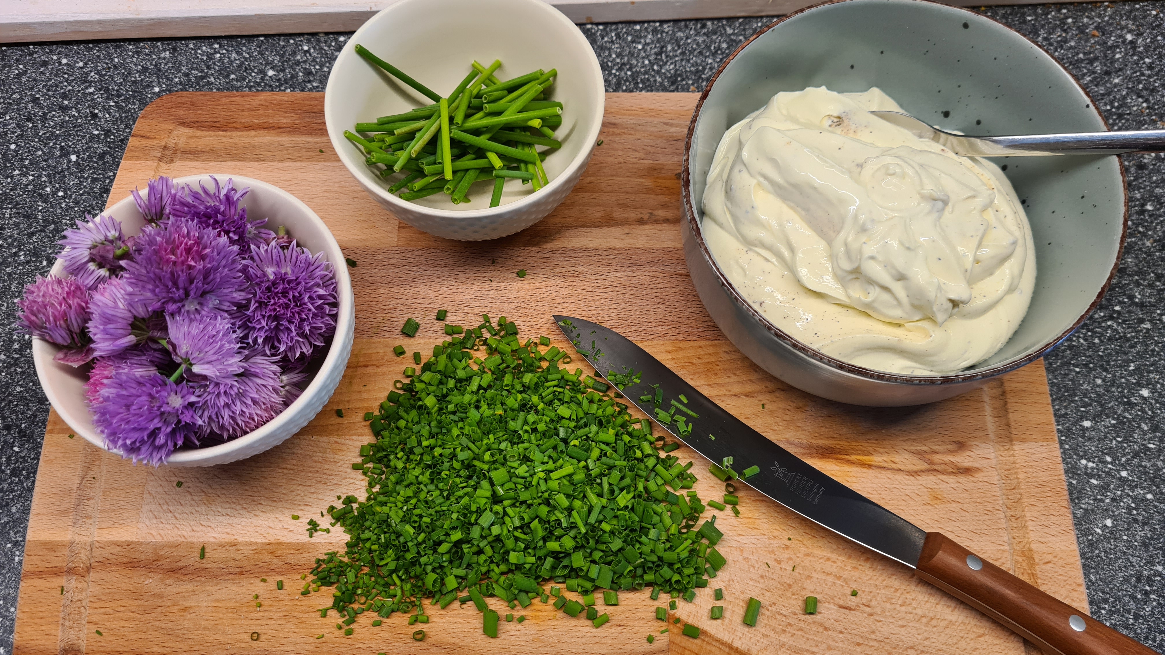 Save a few rolls of chives and some flowers. Then mix everything thoroughly, season well with salt and pepper, and chill the dip for about half an hour before serving, so the flavors can develop. Season again to taste right before serving.