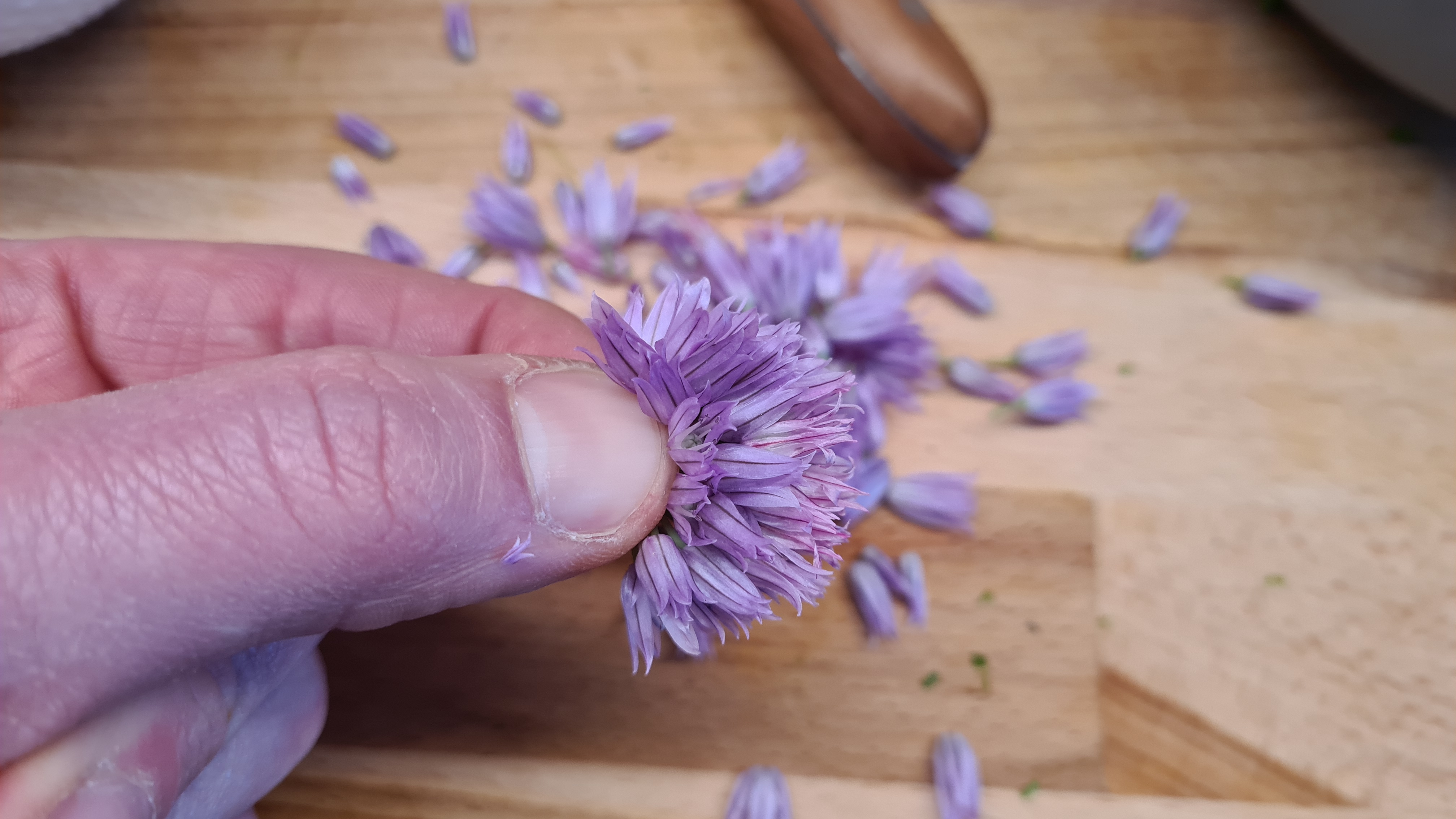 Remove the flour stems and separate them from the rest of the chives. They’re much harder than the chives and don’t really taste that great anymore.